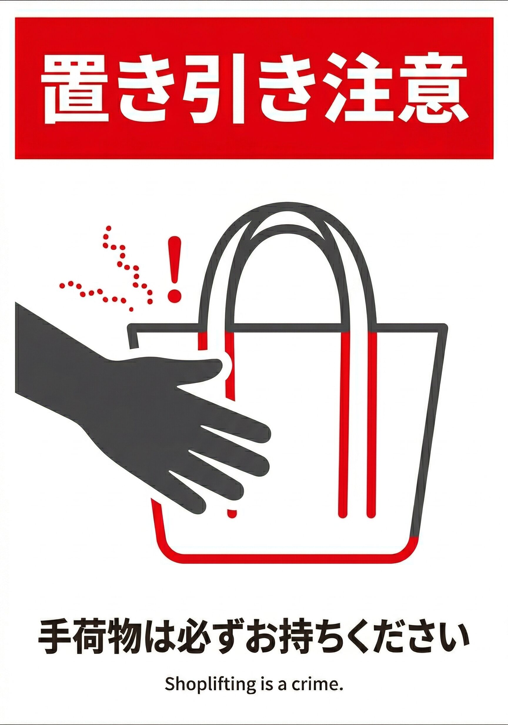 この「置き引き注意」の張り紙は、手荷物や貴重品の管理に注意を促したい場所で使いやすいA4掲示物です。待合スペース、共有ラウンジ、受付まわり、休憩所、店舗や施設の共用部などで掲示しやすい内容です。