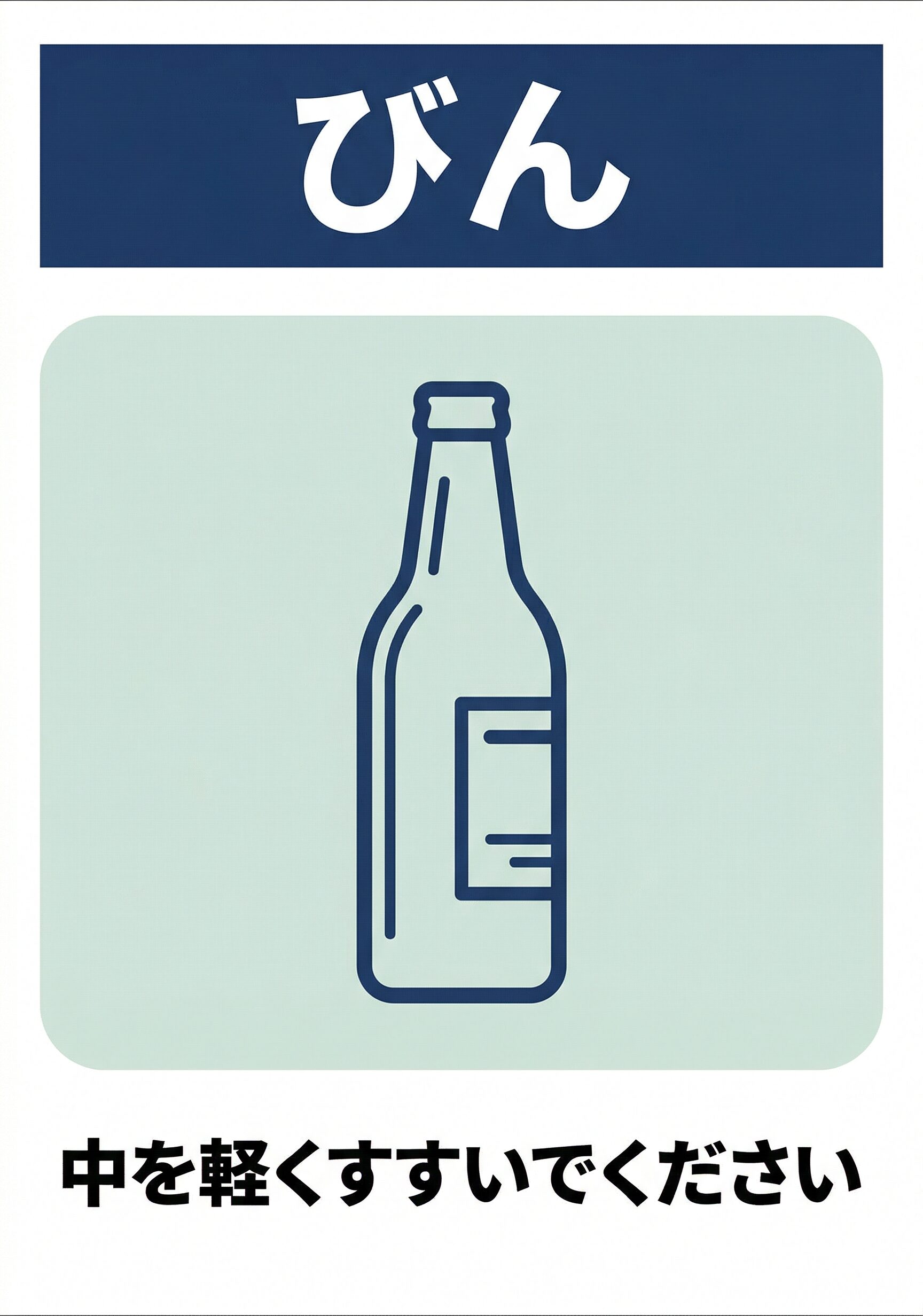 お願い | マナー びん回収(リサイクル) Byharigami 2026年3月30日2026年4月3日 この「びん回収(リサイクル)」の張り紙は、びん類の回収場所をわかりやすく示したい場所で使いやすいA4掲示物です。資源ごみコーナー、共用部の分別スペース、店舗や施設の回収箱まわりなどで掲示しやすい内容です。 びんは割れ物でもあるため、対象を明確に示した案内があると分別と安全管理の両方で役立ちます。利用者に迷いなく行動してもらいたい場面に向いており、印刷してすぐ使える実用的な張り紙です。