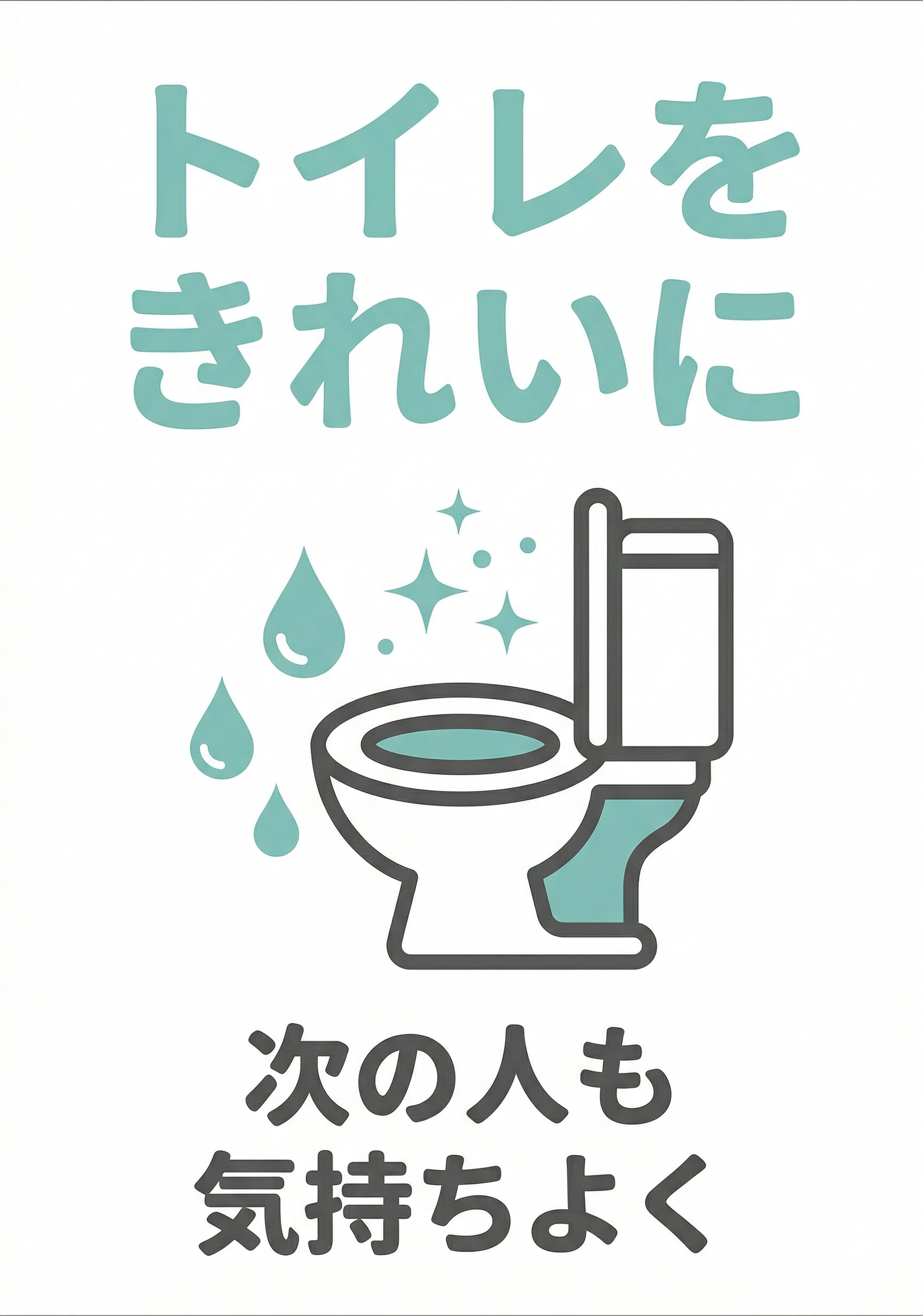 この「トイレをきれいに」の張り紙は、利用後の配慮や簡単な整えを促したい場面で使いやすいA4掲示物です。共用トイレ、施設内の洗面スペース、店舗のトイレ、事務所の共用設備まわりなどで掲示しやすい内容です。