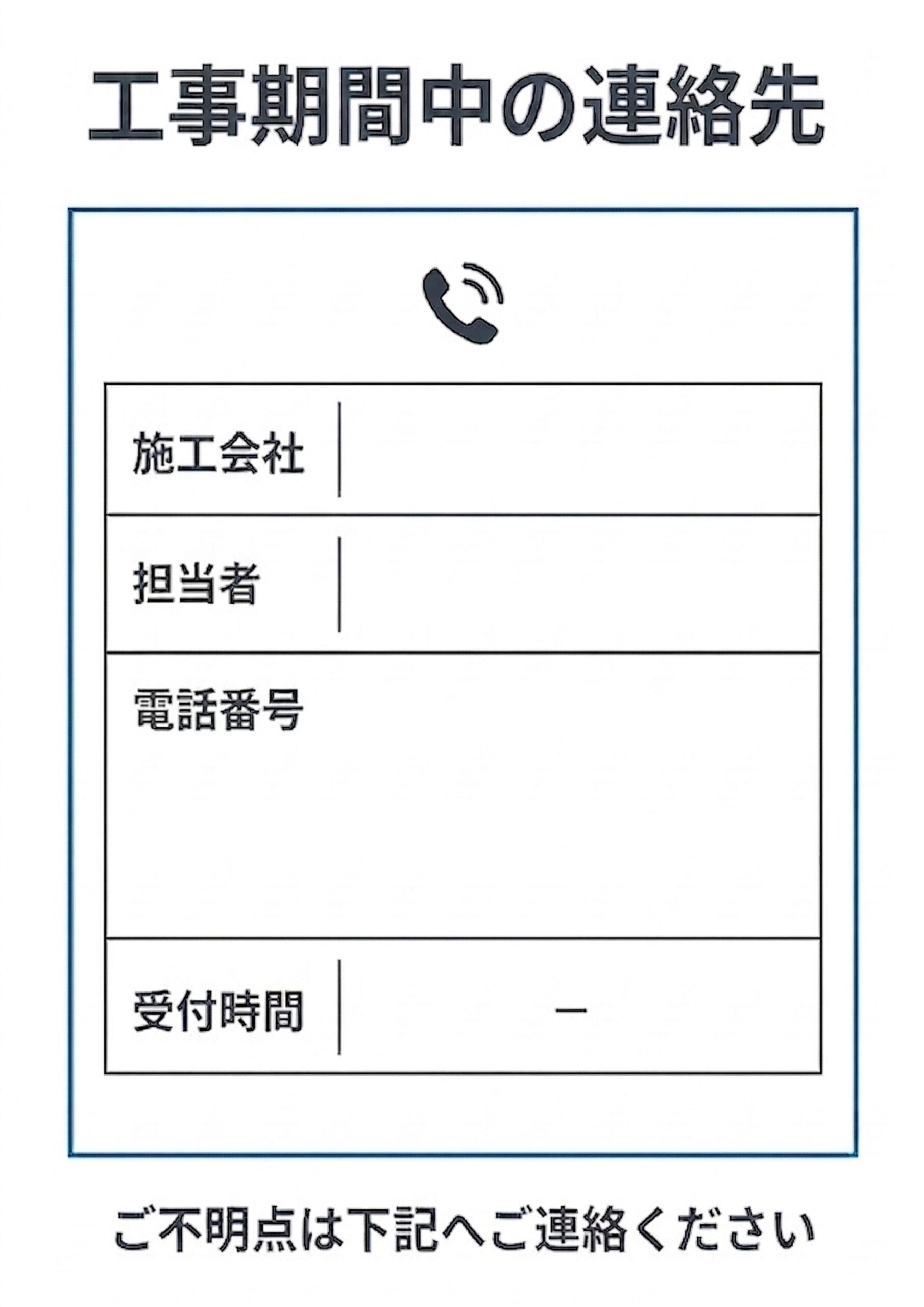 工事中の問い合わせ先が明示されているだけで、現場に対する安心感は大きく変わる。特に集合住宅や店舗まわりでは、誰に連絡すればよいのかが見えないことが不満につながりやすいため、連絡先を整理した掲示があると実務的だ。