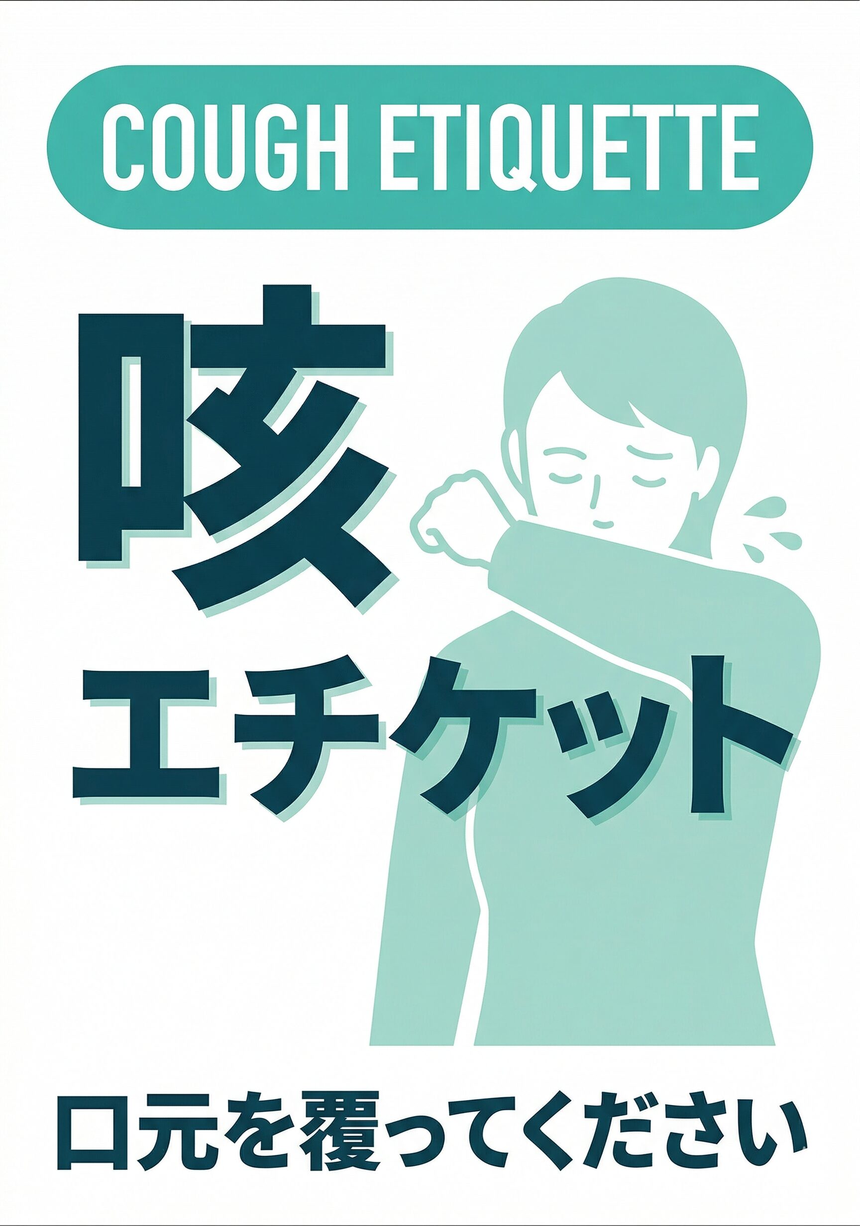 この「咳エチケット」の張り紙は、周囲への配慮や衛生意識をやさしく促したい場所で使いやすいA4掲示用デザインです。待合室、受付、共用スペース、学校、事務所、店舗入口などで、一目で意図が伝わるように、見やすさと分かりやすさを重視して作成しています。