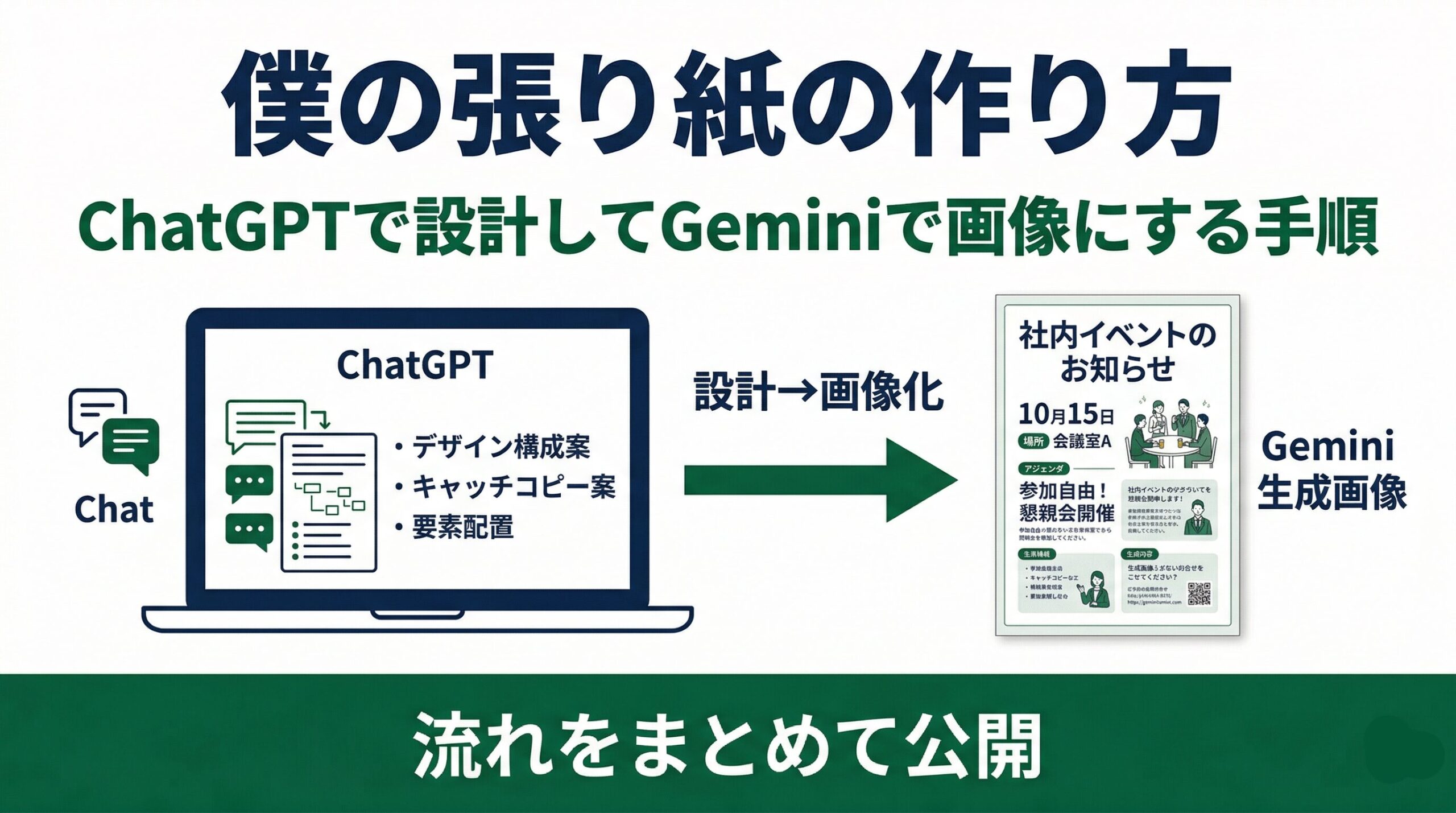 ぼく自身はいま、基本的にこの流れで張り紙を作っています。ChatGPTで内容を整理する。そのあとGeminiで画像にする。この2段で作るようにしてから、見出しがまとまりやすくなり、画像も実際に使える形に近づきやすくなりました。