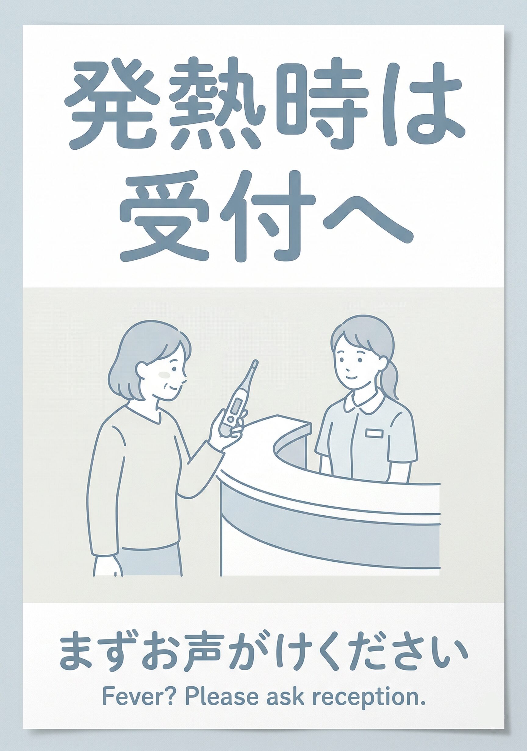 この「発熱時は受付へ」の張り紙は、体調不良時の案内導線を明確にしたい場面で使いやすいA4掲示物です。クリニック、医療・介護施設の入口、受付付近、待合スペースの近くなどで掲示しやすい内容です。