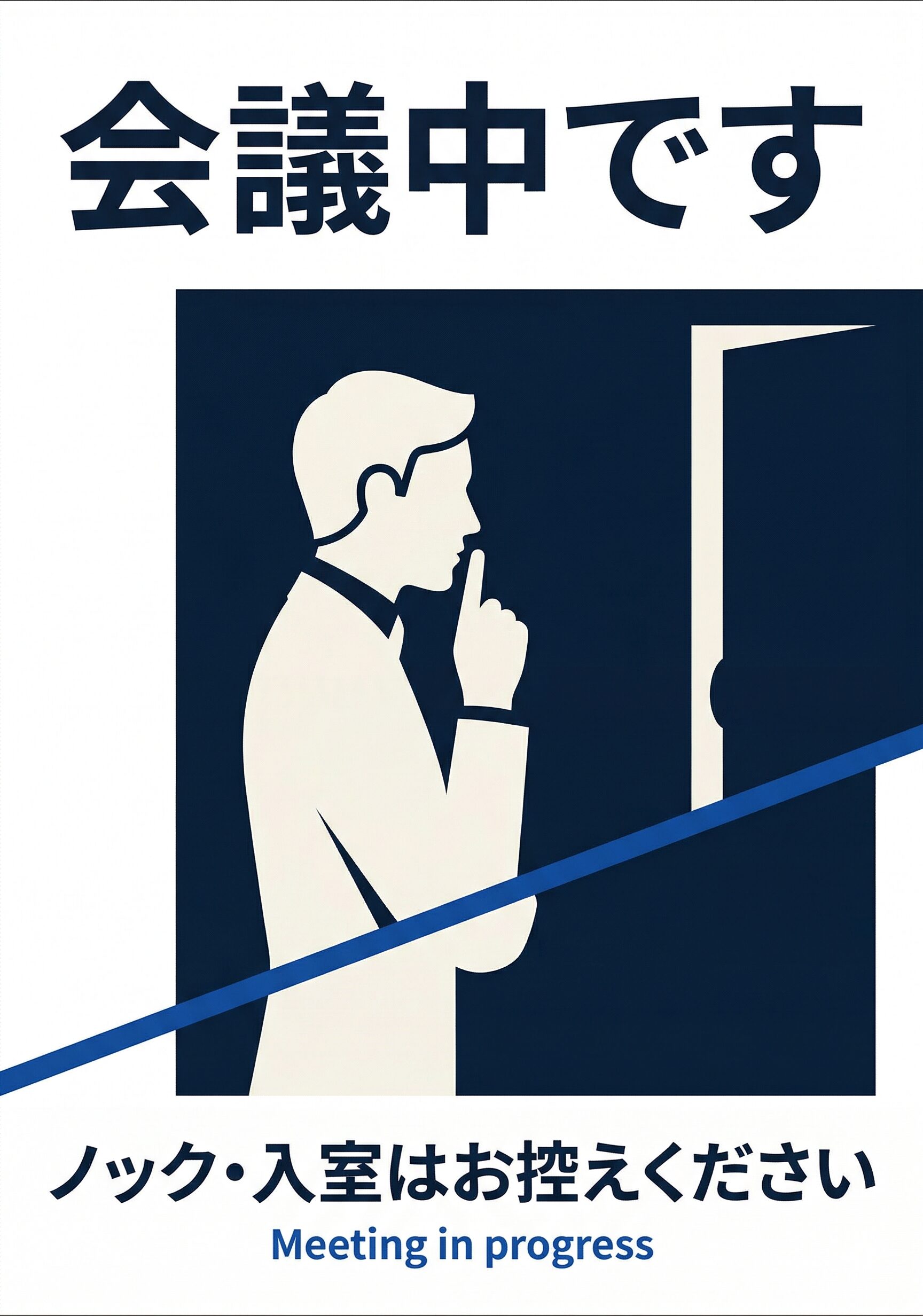 公共施設 | 事務所 | 案内 会議中 Byharigami 2026年3月22日2026年4月3日 この「会議中」の張り紙は、現在会議を行っていることをわかりやすく伝えたい場所で使いやすいA4掲示物です。会議室の入口、事務室、打ち合わせスペース、共有ラウンジの一角などで掲示しやすい内容です。 会議中であることを見える形で示しておくことで、入室や声かけのタイミングを調整しやすくなります。業務の妨げを減らしたい場面に向いている実用的な張り紙です。
