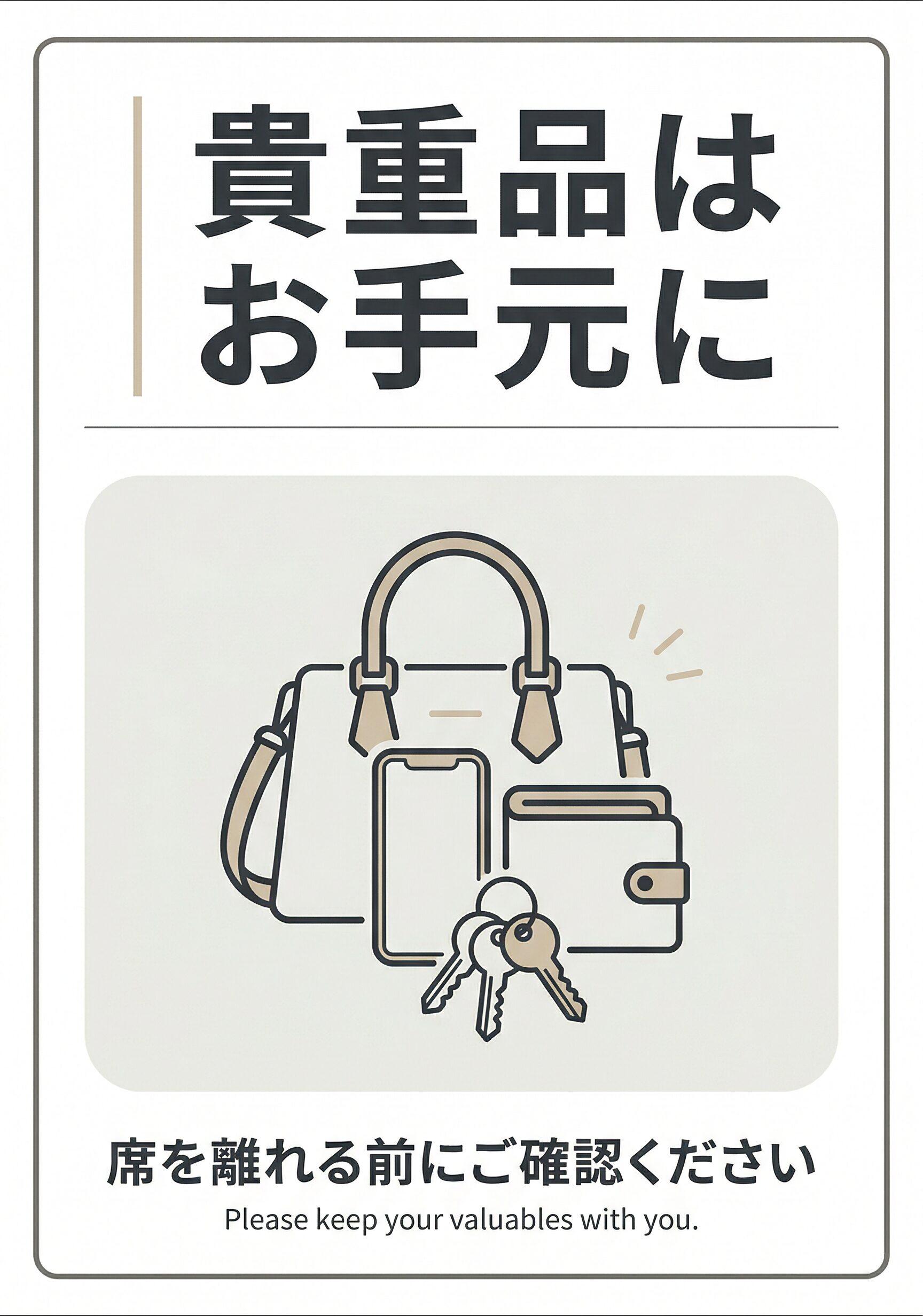 財布やスマートフォンなどの管理を見える形で呼びかけることで、置き引きや紛失の予防につながりやすくなります。やさしく注意を促しながら、防犯意識も高めたい場面に向いている実用的な張り紙です。