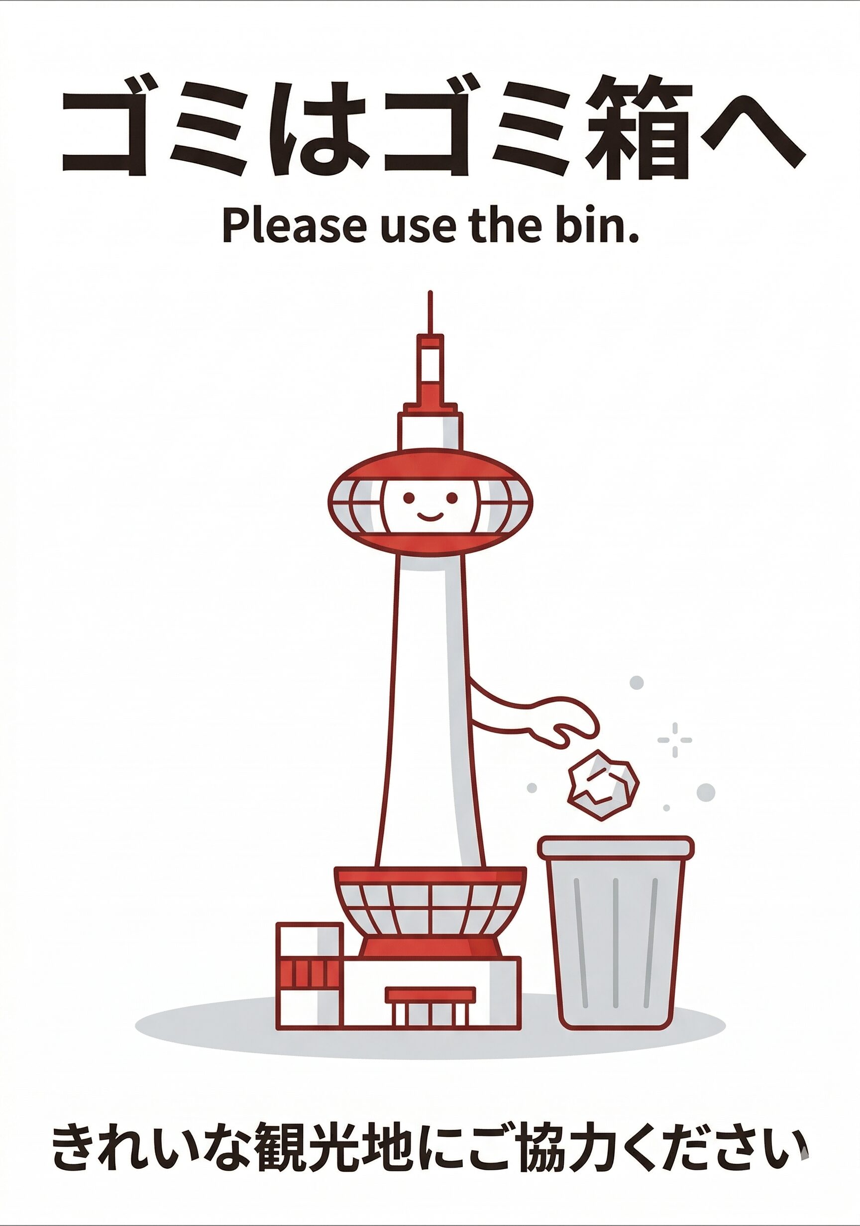 観光地 京都府(京都タワー) Byharigami 2026年3月31日2026年4月3日 京都府の京都タワーをモチーフにした、観光地向けの張り紙デザインです。駅周辺や観光案内所、商業施設、公共施設の共用部などで使いやすく、京都のランドマークらしさを活かしながら来訪者へ自然にマナー案内ができます。 白い塔身と赤い展望部のコントラストを主役にすることで、遠目でも印象が伝わりやすく、景観を損ねにくいのが特長です。短い文言と整理された構成で、観光地の雰囲気を保ちながらゴミ箱利用をやさしく促したい場面に向いています。