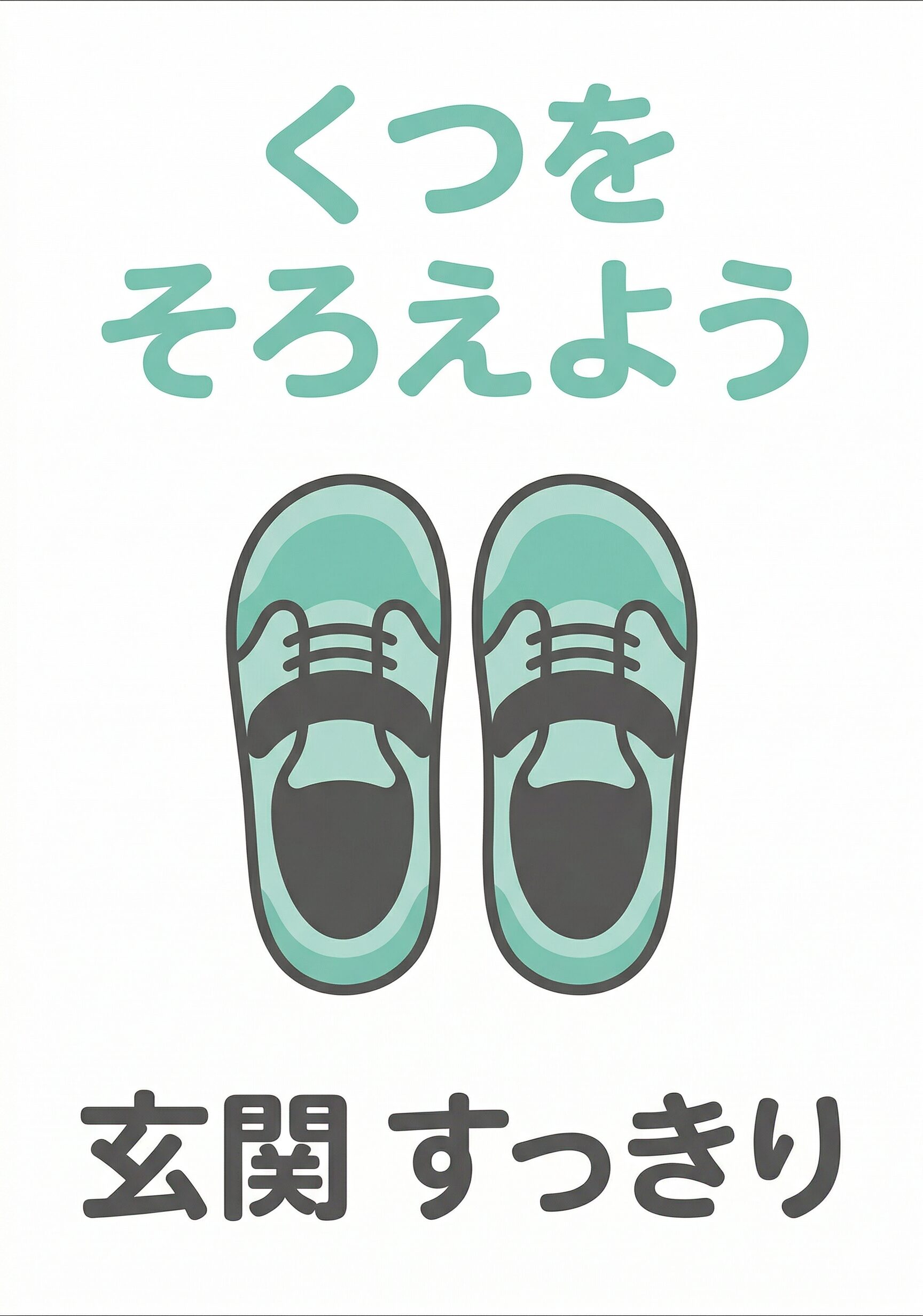 この「くつをそろえよう」の張り紙は、靴を整えて置いてもらいたい場所で使いやすいA4掲示物です。玄関、脱衣所、施設の入口、共有スペースの靴置き場などで掲示しやすい内容です。