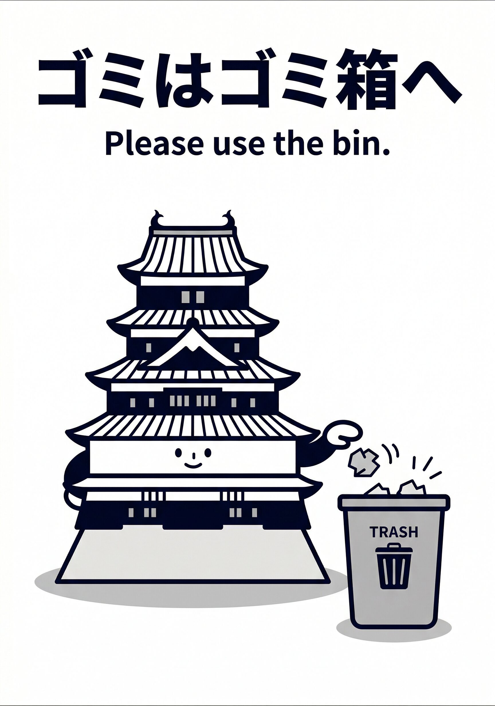 観光地 長野県(松本城) Byharigami 2026年3月31日2026年4月3日 長野県の松本城をモチーフにした、観光地向けの張り紙デザインです。観光案内所や駅周辺、商業施設、公共施設の共用部などで使いやすく、黒と白の美しい対比を活かしながら来訪者へ自然にマナー案内ができます。 引き締まった黒い天守と白い縁取りのシルエットを主役にすることで、遠目でも印象が伝わりやすく、景観を損ねにくいのが特長です。短い文言と整理された構成で、城下町の落ち着いた雰囲気を保ちながらゴミ箱利用をやさしく促したい場面に向いています。