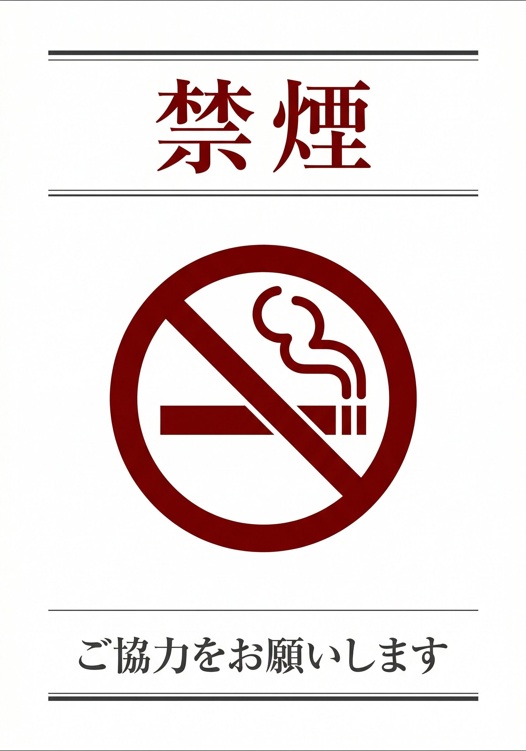 この「禁煙」の張り紙は、施設内や共用スペースでの喫煙を控えてほしい場面に使いやすいA4掲示物です。クリニック、ホテル・宿泊施設、事務所、公共施設、医療・介護施設、学校、工場、観光地、集合住宅、駐車場など、幅広い場所で掲示しやすい内容です。