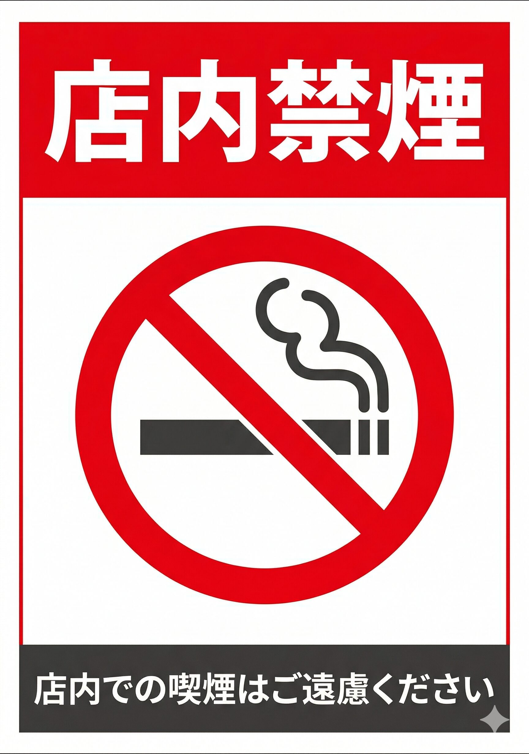 店内の禁煙ルールは、短く明確に示すことで理解されやすくなります。利用者への案内を整理しながら、現場での説明負担も減らしやすく、店舗運営に取り入れやすい実用的な張り紙です。