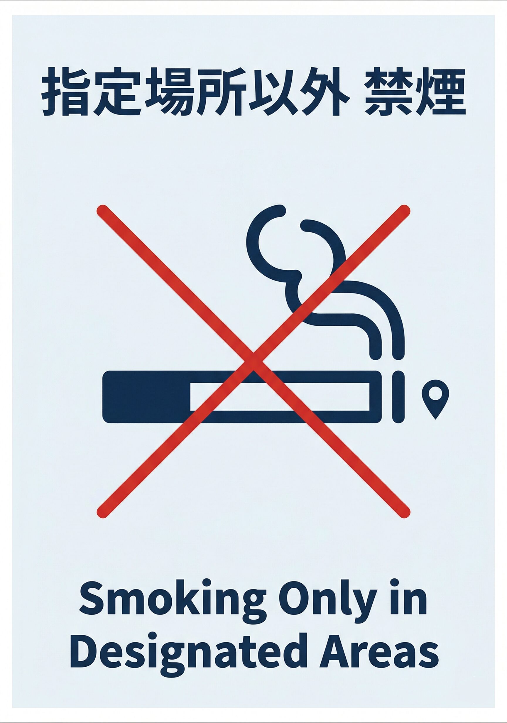 ルールを曖昧にすると現場での案内が増えやすいので、喫煙可能な範囲をはっきり分けて示すのが大事だね。休憩所の入口や共用通路の分岐点など、判断が必要な場所に掲示すると運用しやすいよ。
