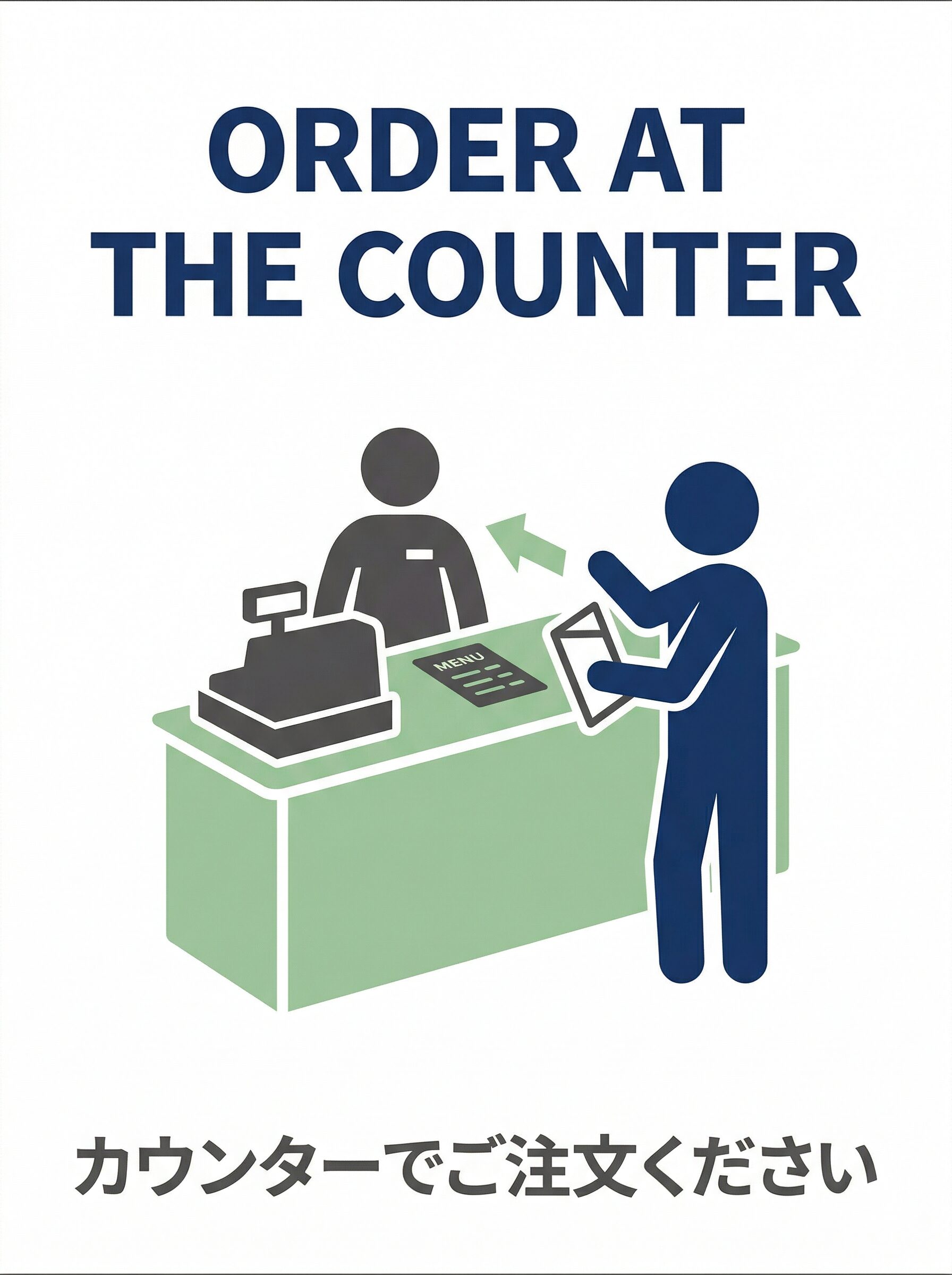 案内 カウンターでご注文くださいの英語メイン張り紙|観光客向け飲食店サイン Byharigami 2026年4月13日 セルフ注文の店では、席で待つのか、先にカウンターへ行くのかが伝わらず、観光客が迷いやすくなります。この張り紙は、注文場所を短く明確に伝えるためのものです。 英語メインの見出しとカウンターピクトを組み合わせると、説明の手間を減らしやすくなります。日本語は補助文一行にとどめると、視認性を保ちやすくなります。 フードコート型、ラーメン店、テイクアウト併設店など、注文動線が店ごとに異なる業態で使いやすいサインです。