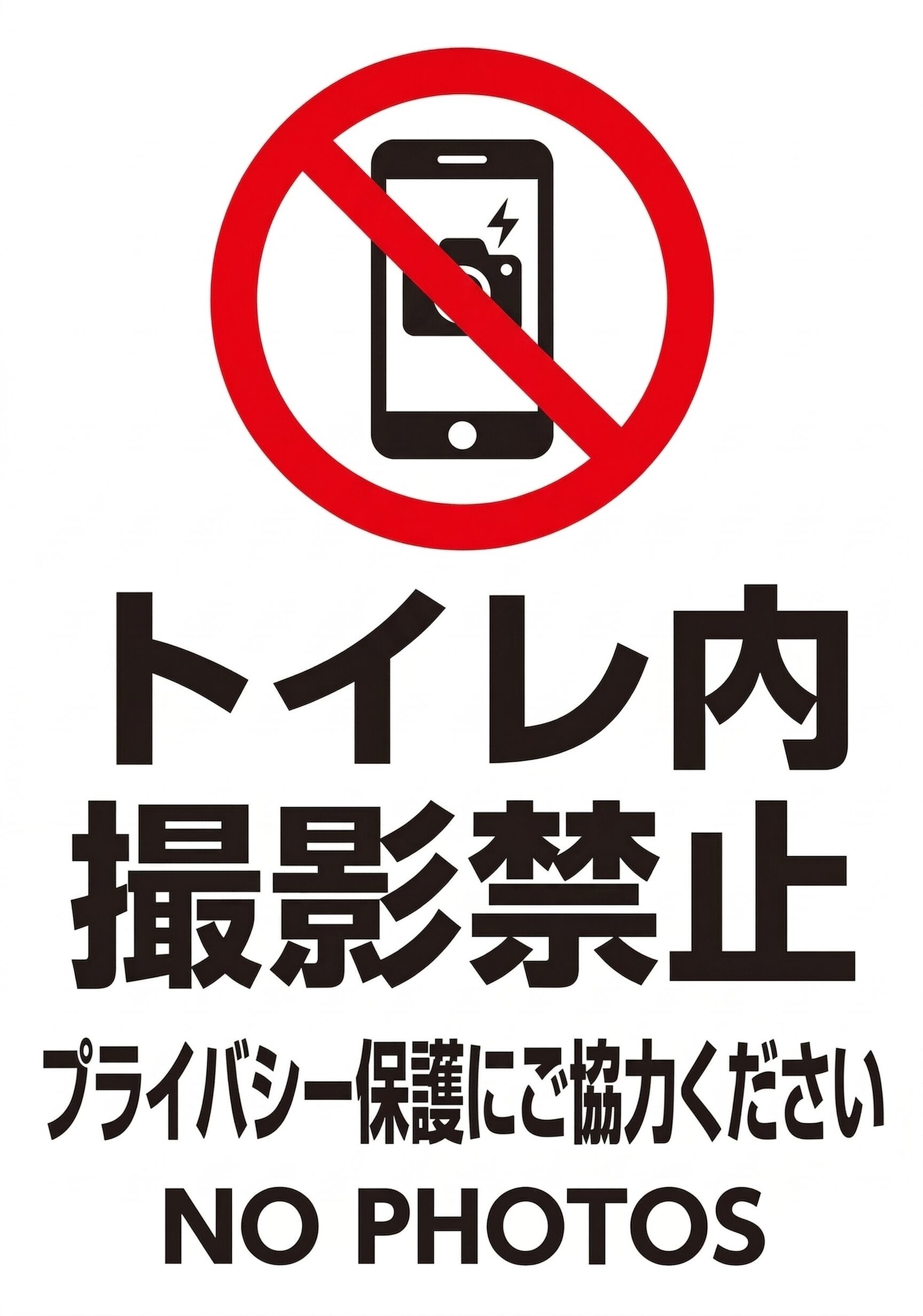 トイレ内での撮影は、利用者の安心感や施設の信頼性に大きく関わるため、明確な禁止表示が重要です。このデザインは、公共施設、商業施設、駅、オフィス、病院、学校、宿泊施設など、幅広い場所で使いやすく、短い文言でも意図が伝わりやすい構成です。強い注意喚起でありながら、施設内で過度に浮きすぎない実用的な張り紙として活用できます。