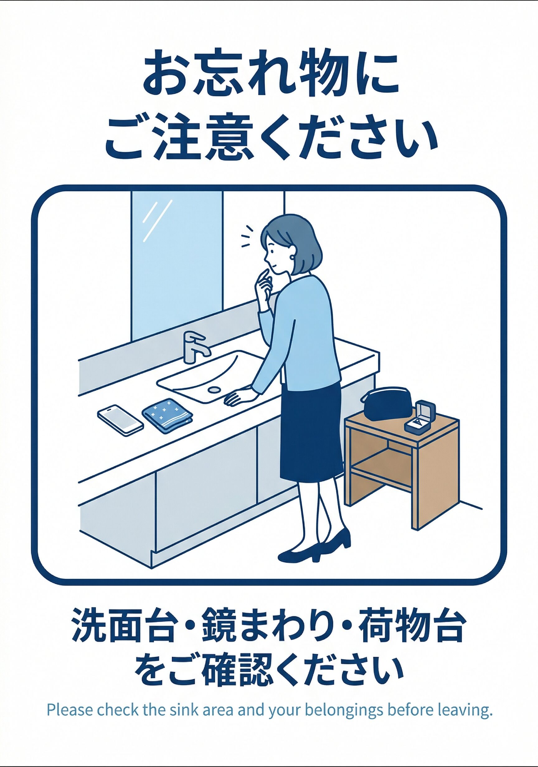 印刷後は、出入口付近、カウンターまわり、席を立つ前に目に入りやすい場所への掲示がおすすめです。必要に応じて、「お帰りの前にご確認ください」などの補助文を近くに追加すると、さらに分かりやすくなります。