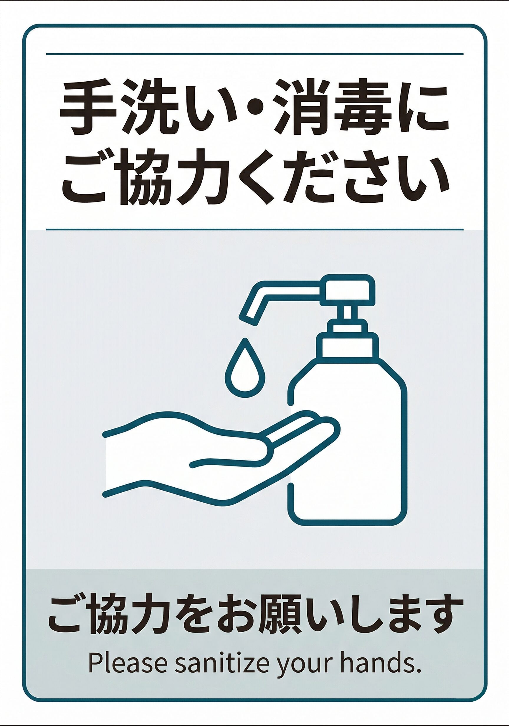 手洗いと消毒の両方を短くわかりやすく伝えられるため、日常的な衛生案内として使いやすいのが特長です。やさしい表現で行動を促したい場面に向いている実用的な張り紙です。