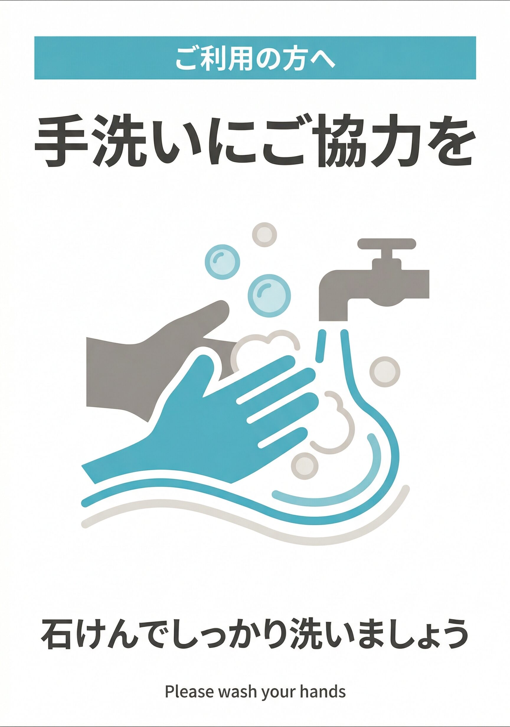 お願い | クリニック | マナー | 医療・介護施設 | 工場・作業場 | 衛生 手洗いにご協力を Byharigami 2026年3月25日2026年4月3日 この「手洗いにご協力を」の張り紙は、衛生管理のために手洗いを促したい場所で使いやすいA4掲示物です。入口付近、洗面所、トイレ前、作業場、休憩室、共有スペースなどで掲示しやすい内容です。 手洗いの案内を見える形で掲示しておくことで、利用者やスタッフの衛生意識を自然に高めやすくなります。感染対策や日常の清潔管理をわかりやすく伝えたい場面に向いており、公共施設や事業所でも使いやすい実用的な張り紙です。