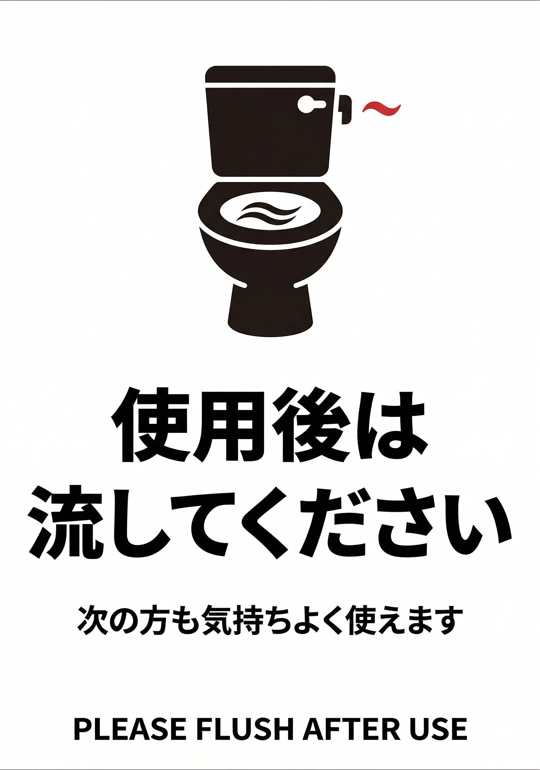 この「使用後は流してください」の張り紙は、トイレ利用後の基本的なルールをわかりやすく案内したい場所で使いやすいA4掲示物です。共用トイレ、公共施設、宿泊施設、店舗、医療機関などで掲示しやすい内容です。