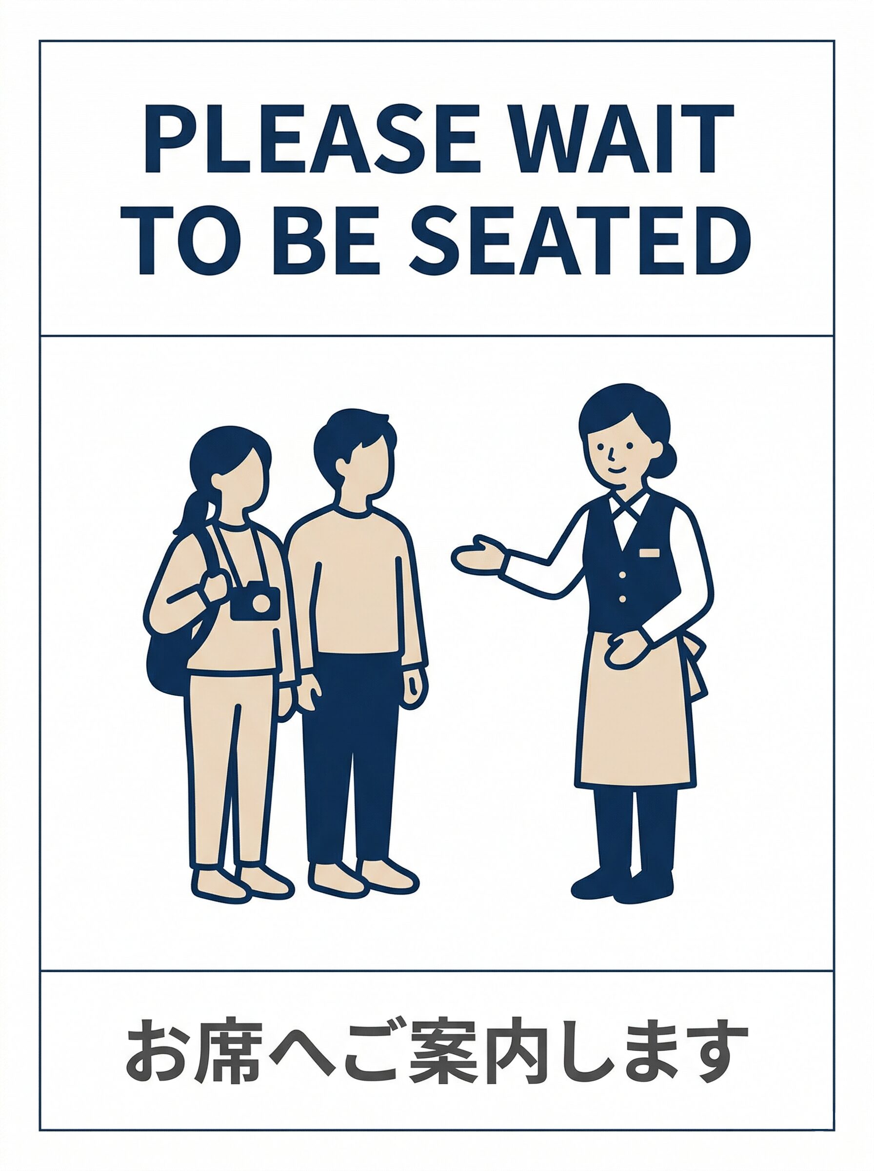 外国人観光客の多い飲食店では、空席があっても案内前に着席される場面が起きやすくなります。この張り紙は、入口で立ち止まってもらい、スタッフが席へ案内する流れをやさしく伝えるためのものです。