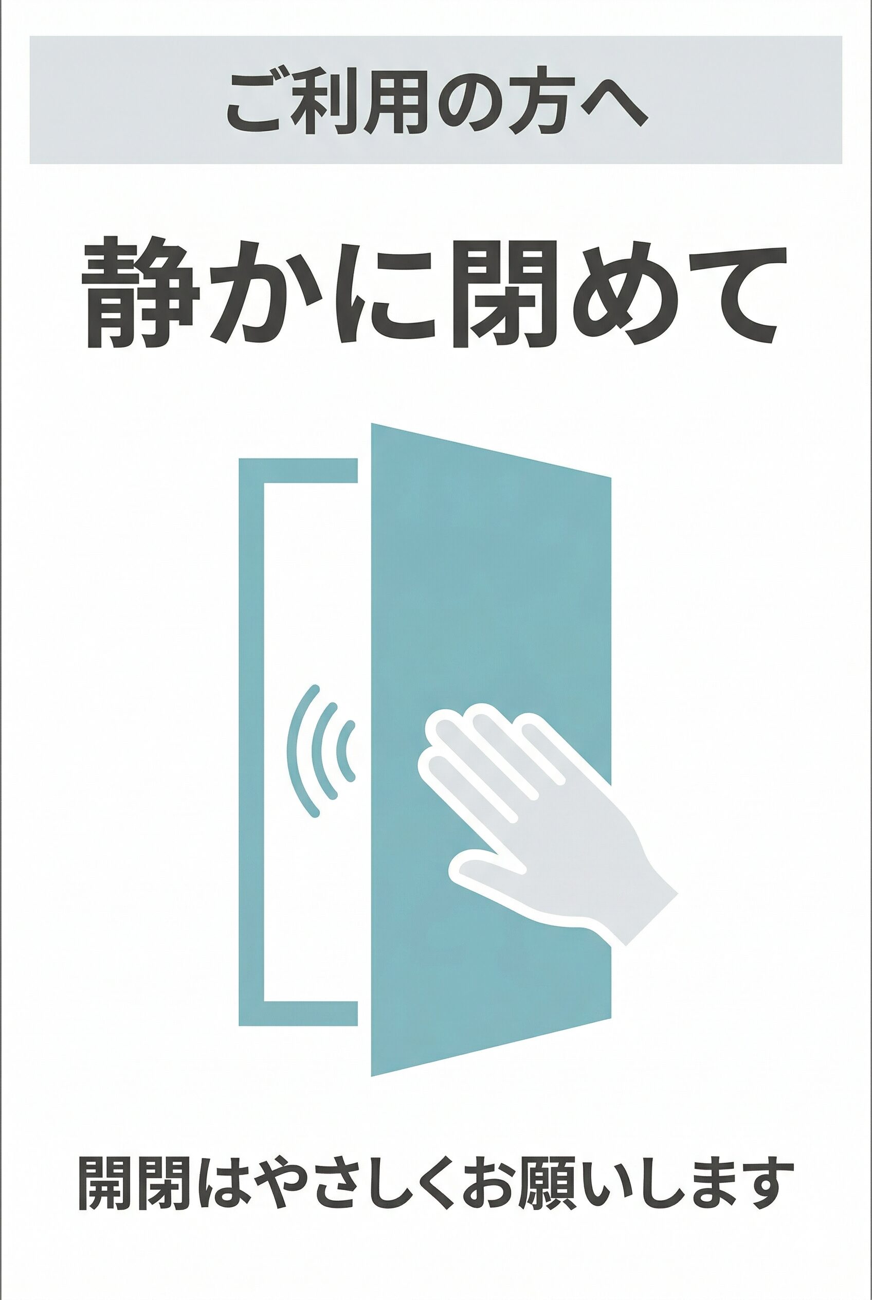 扉を静かに閉めてもらうだけでも、周囲の快適さや落ち着きは保ちやすくなります。強い注意表現を使わずにやさしく伝えたい場面に向いており、日常のマナー案内としてそのまま使いやすい張り紙です。