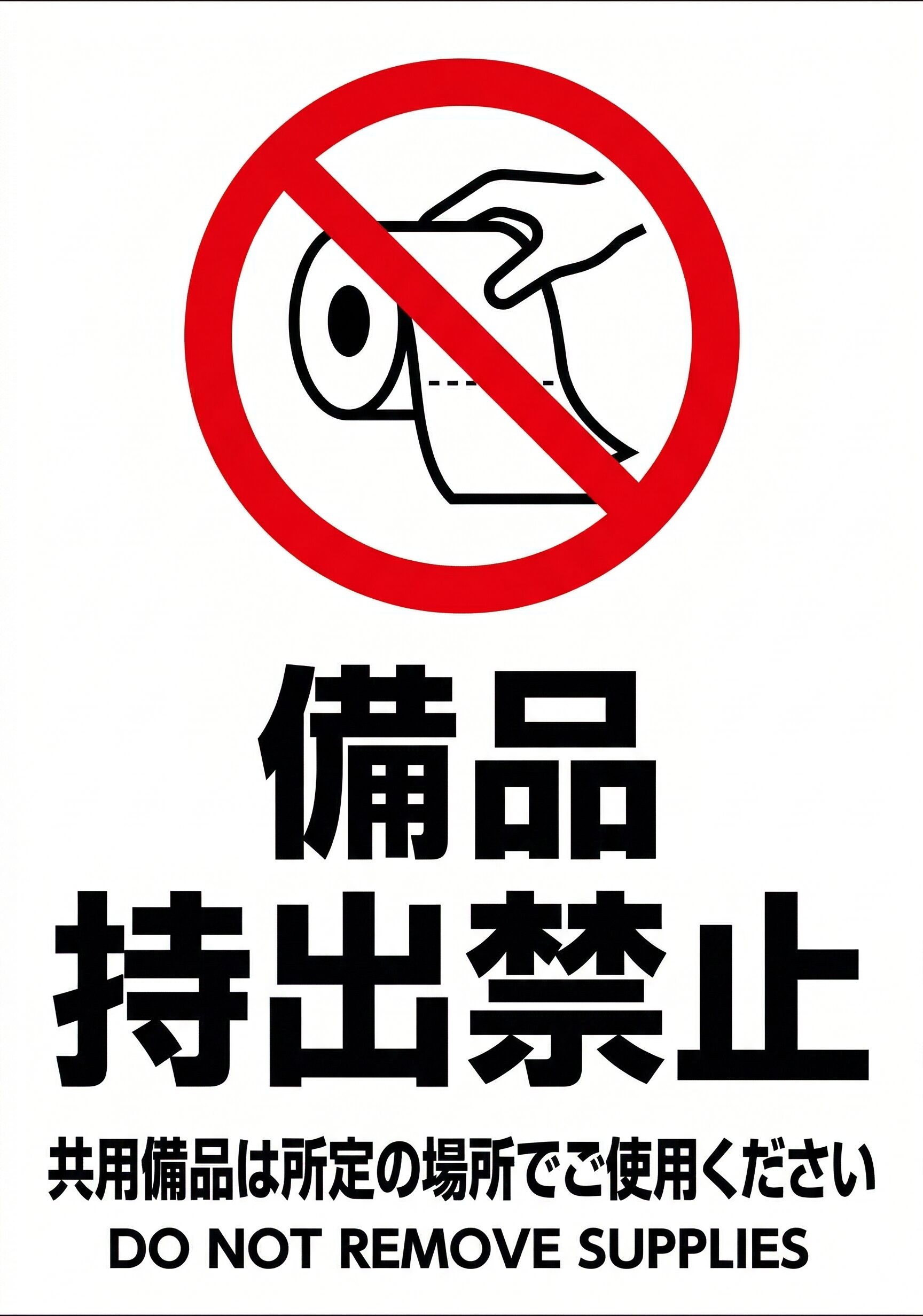 この「備品持ち出し禁止」の張り紙は、施設や共有スペースの備品を持ち出してほしくない場所で使いやすいA4掲示物です。事務所、休憩室、共有ラウンジ、倉庫前、備品棚の近くなどで掲示しやすい内容です。