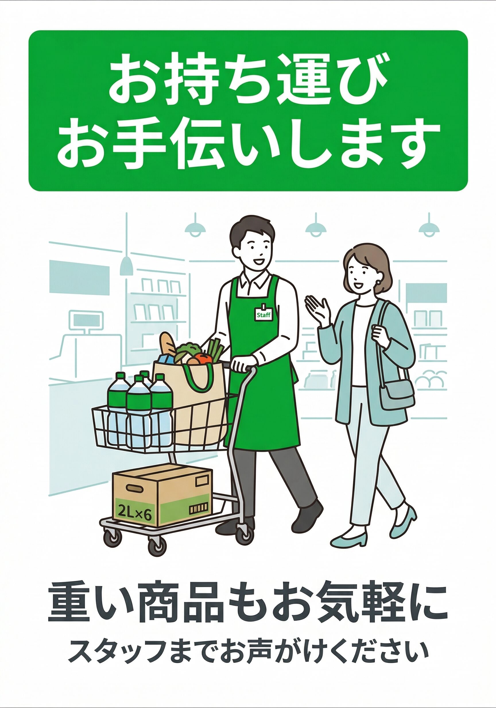 この張り紙は、スーパーや量販店の飲料売場で使いやすい案内です。特に、ケース販売の飲料やまとめ買いが多い売場で、持ち運びの負担を減らしたい場面に向いています。重さのある商品でも相談しやすい雰囲気をつくりたいときに使いやすいです。