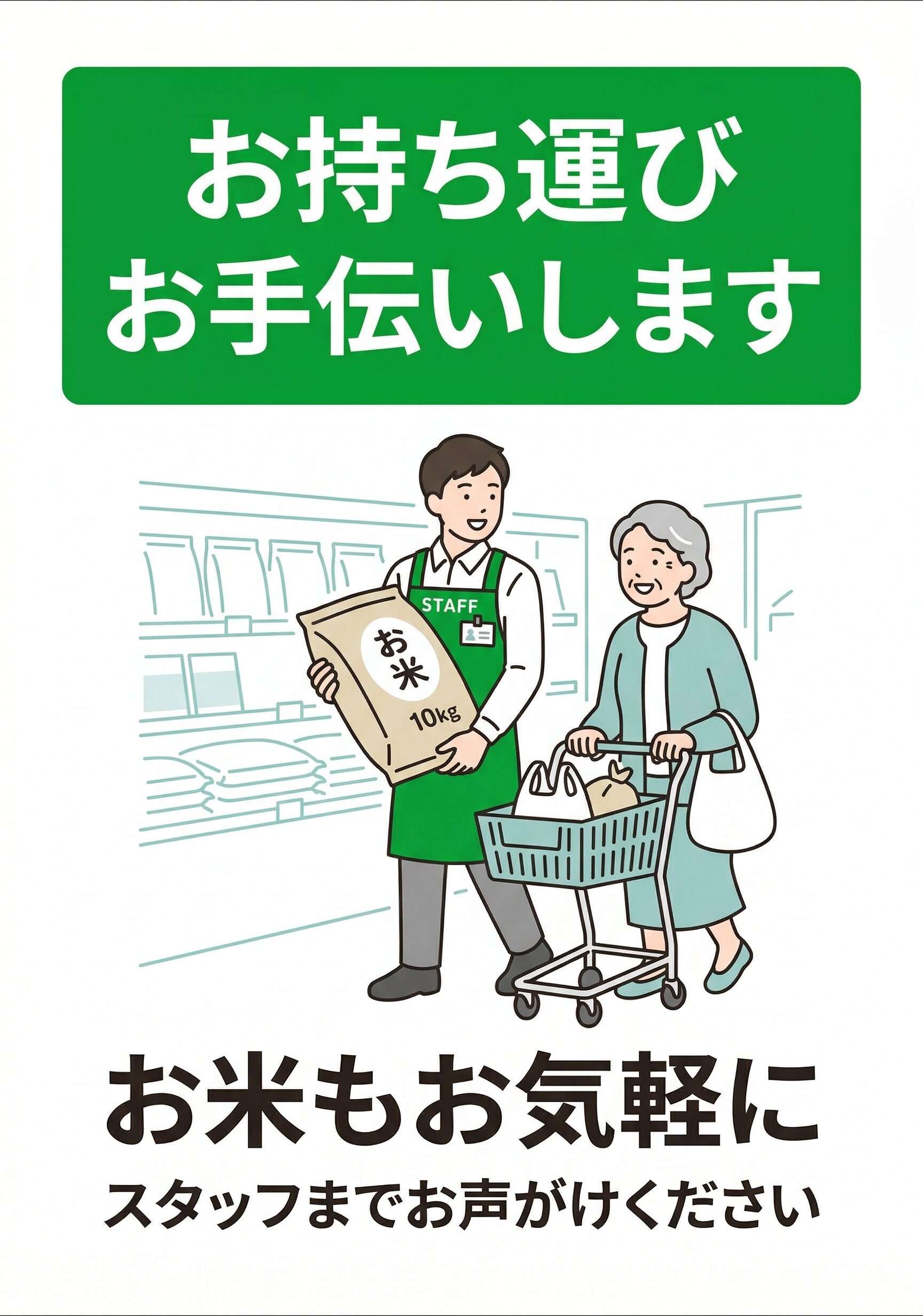 この張り紙は、スーパーの米売場や食品売場で使いやすい案内です。特に、5kgや10kgの米袋を購入したお客様に対して、スタッフがお手伝いできることを短くやさしく伝えたい場面に向いています。高齢のお客様やまとめ買いのお客様が多い店舗では、接客の安心感を出しやすい案内として使いやすいです。