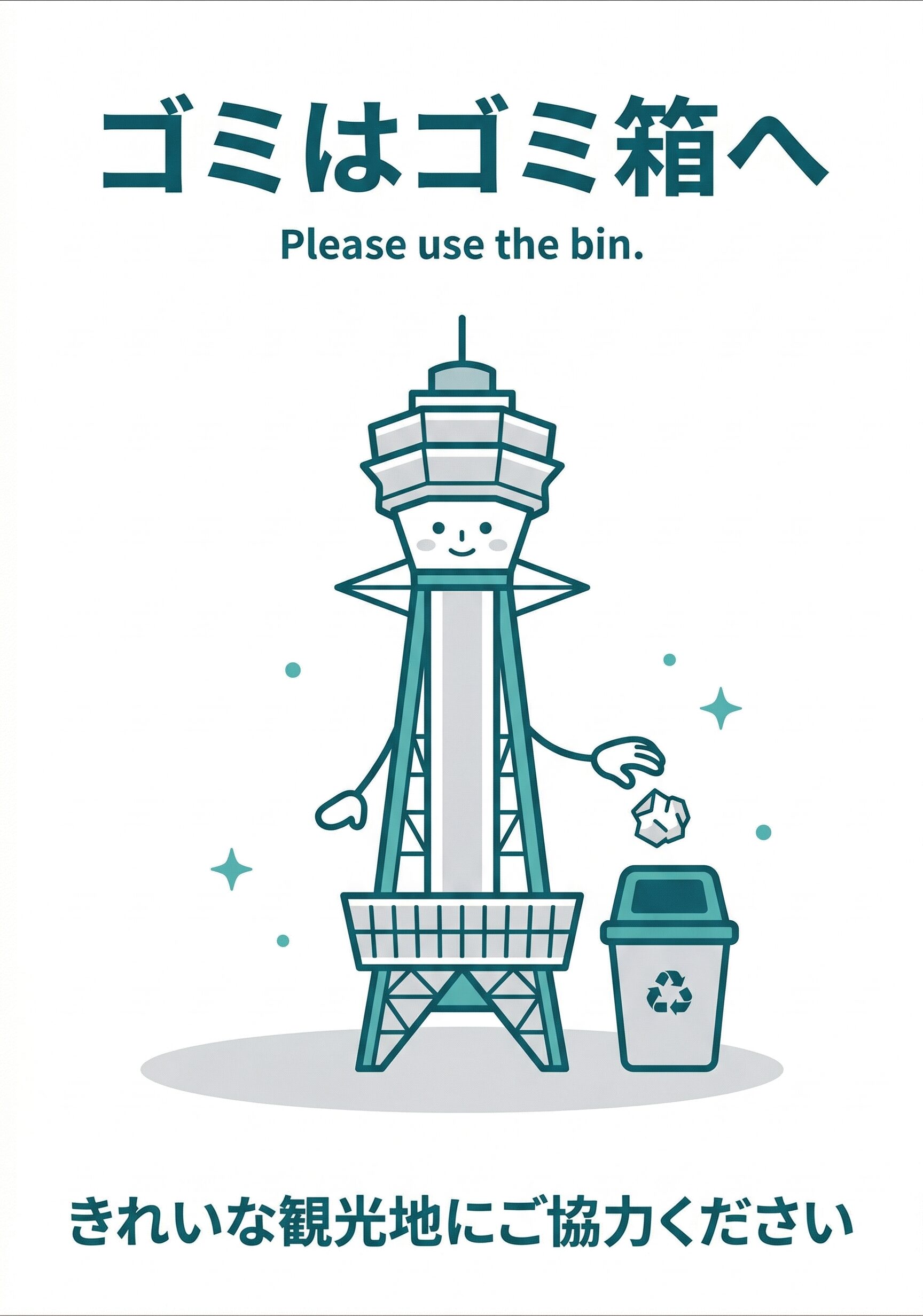 観光地 大阪府(通天閣) Byharigami 2026年3月31日2026年4月3日 大阪府の通天閣をモチーフにした、観光地向けの張り紙デザインです。駅周辺や商業施設、観光案内所、公共施設の共用部などで使いやすく、大阪らしい親しみやすさを出しながら来訪者へ自然にマナー案内ができます。 通天閣の特徴的な塔の形を主役にすることで、遠目でも印象が伝わりやすく、景観を損ねにくいのが特長です。短い文言と整理された構成で、観光地の雰囲気を保ちながらゴミ箱利用をやさしく促したい場面に向いています。
