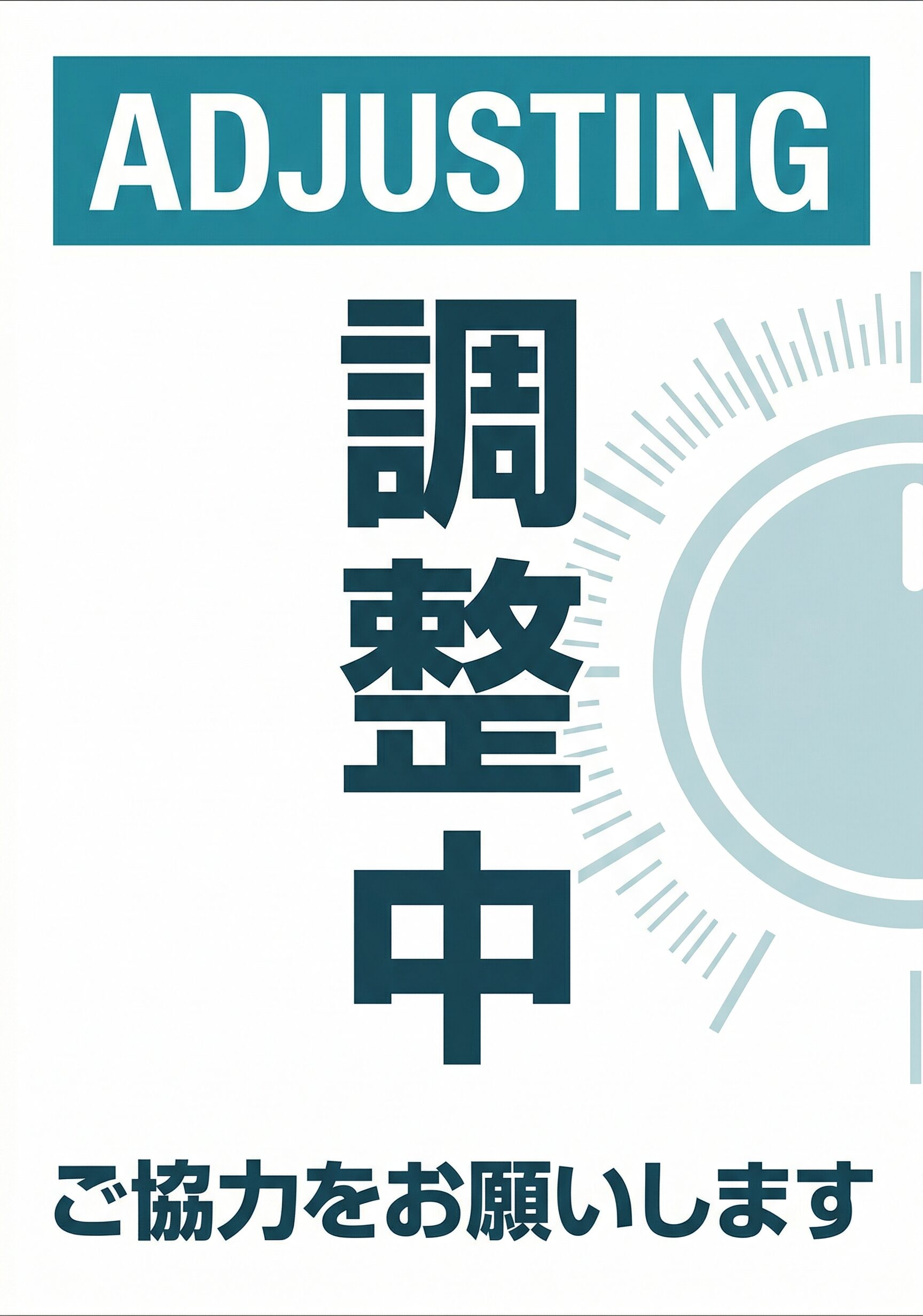 この「調整中」の張り紙は、設備やスペース、運用内容などが一時的に利用できない状態を分かりやすく案内したい場面で使いやすいA4掲示用デザインです。受付、機器まわり、共用設備、店舗内、施設案内板などで、一目で状況が伝わるように、見やすさと分かりやすさを重視して作成しています。
