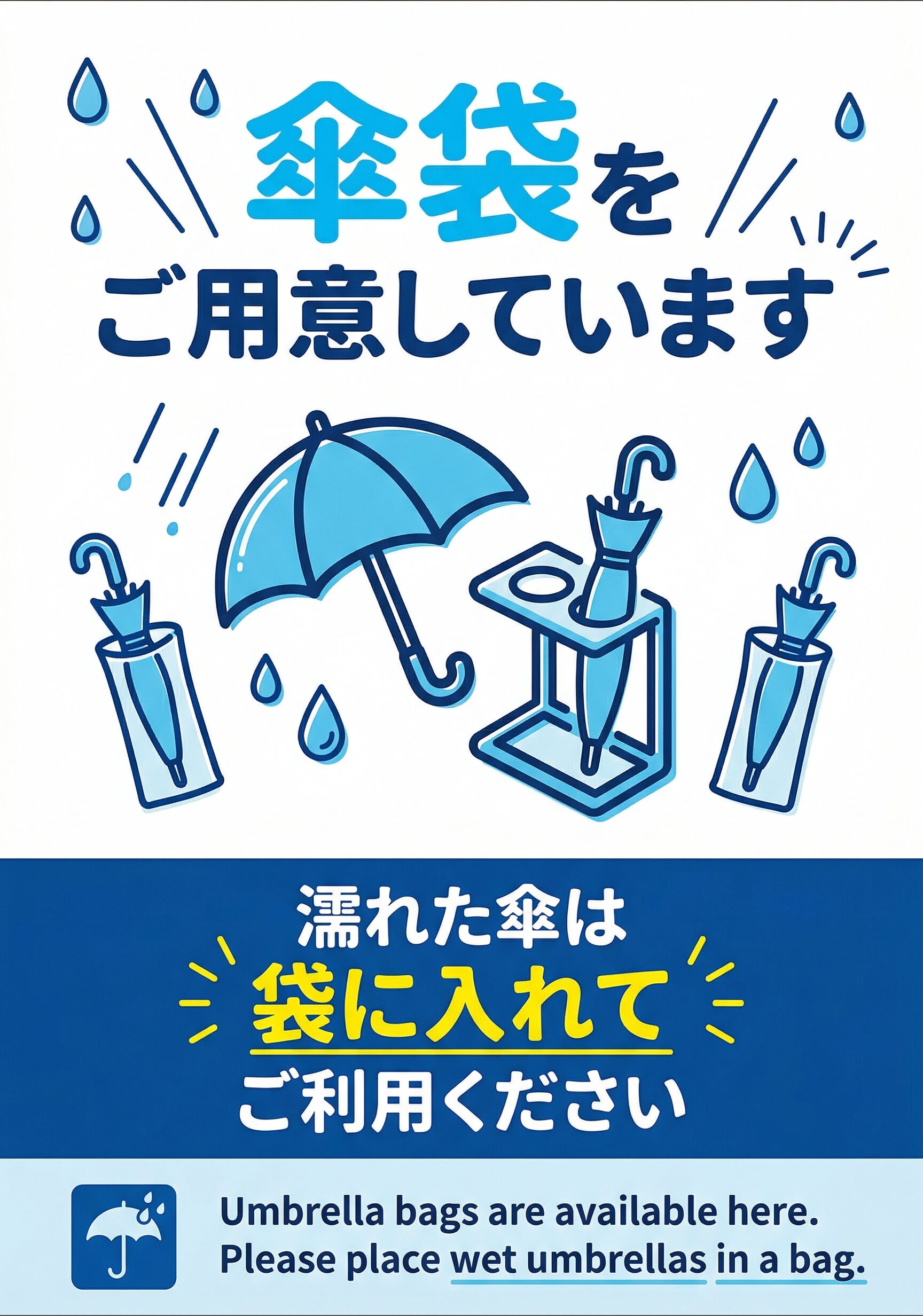 この「傘袋ご用意しています」の張り紙は、雨天時に来訪者へ傘袋の設置を分かりやすく案内したい場所で使いやすいA4掲示用デザインです。店舗入口、施設玄関、事務所受付、病院、学校、商業施設などで、一目で意図が伝わるように見やすさを重視して作成しています。